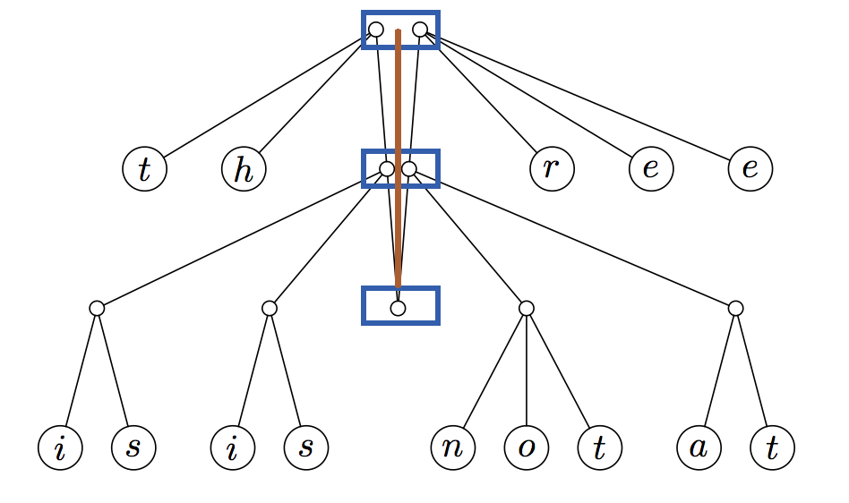 这种新的数据结构被称为手指树。手指树由沿其树脊(棕色线)分布的几层(下方蓝色框)组成: