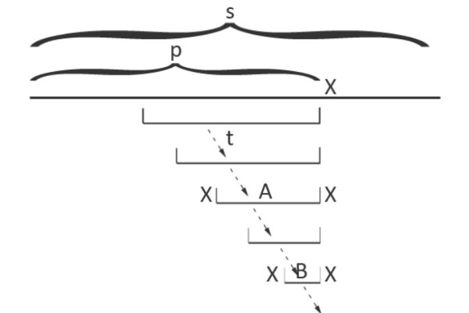 正确性证明 以上图为例,增加当前字符 X,由线性状态数的证明,我们只需要找到包含最后一个字符 X 的最长回文后缀,也就是 XAX。继续寻找 XAX 的最长回文后缀 XBX,建立后缀链接。XBX 对应状态已经在回文树中出现,包含最后一个字符的回文后缀就是 XAX,XBX 本身及其对应状态在 fail 树上的所有祖先。
