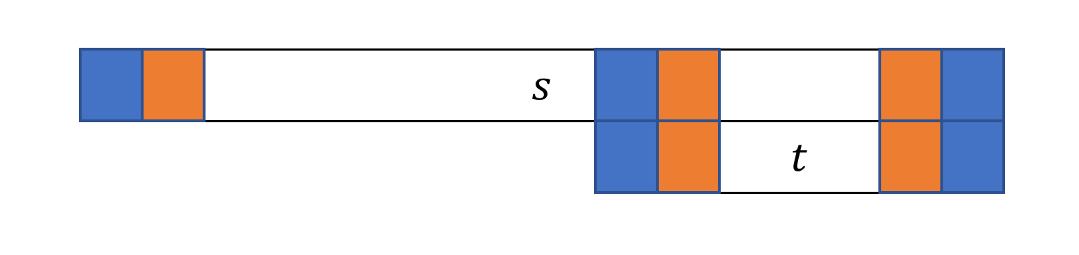 证明 由引理 的推论, 是 的最小周期, 是 的最小周期。考虑反证法,假设 ,因为 是 的后缀,所以 既是 的周期,也是 的周期,而 是 的最小周期,矛盾。所以 。 因为 是 的 border,所以 是 的前缀,设字符串 ,满足 (如下图所示),其中 是 的 border。考虑反证法,假设 ,那么 ,所以由引理 , 是回文串,由引理 , 是 的 border,又因为 ,所以 ,矛盾。所以 。 都是 的前缀, ,所以 。