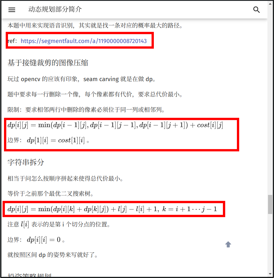 一般情况下,我们建议将引用的资料列在文末的 ##参考资料与注释 一节,并在原句后面加上脚注,而不是直接给出链接。同时一定要避免使用 LaTeX 公式表达代码,上图中两个中括号就是不规范的写法。我们建议使用 dp(i,j) 或者 dp_{i,j}。