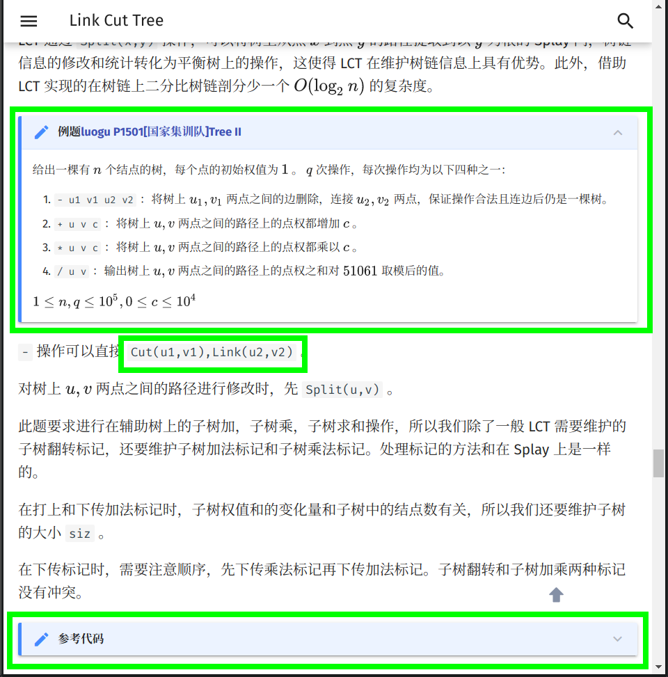 使用 MkDocs 扩展语法,让例题题面与算法描述区分开。将代码折叠,可以让文章更紧凑。(毕竟看 Wiki 的大多数是了解思路,除了模板代码需要阅读外,习题的代码大多可以折叠。)在描述函数操作时,使用行内代码和 LaTeX 公式都是不错的选择。