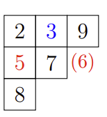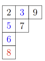 同理,若满足同一列中的数字严格递增,且同一行中的数字单调递增,则该斜杨表被称作 半标准斜杨表;若半标准斜杨表满足各方格不重复的填入数字
