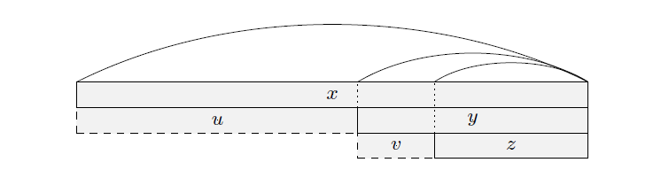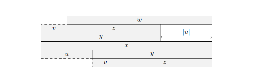 证明 由引理 的推论, 是 的最小周期, 是 的最小周期。考虑反证法,假设 ,因为 是 的后缀,所以 既是 的周期,也是 的周期,而 是 的最小周期,矛盾。所以 。 因为 是 的 border,所以 是 的前缀,设字符串 ,满足 (如下图所示),其中 是 的 border。考虑反证法,假设 ,那么 ,所以由引理 , 是回文串,由引理 , 是 的 border,又因为 ,所以 ,矛盾。所以 。 都是 的前缀, ,所以 。